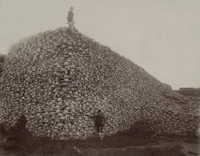 Фотография 1892 года, на которой изображена груда черепов бизонов в Детройте (штат Мичиган), их измельчали и использовали в качестве удобрения.