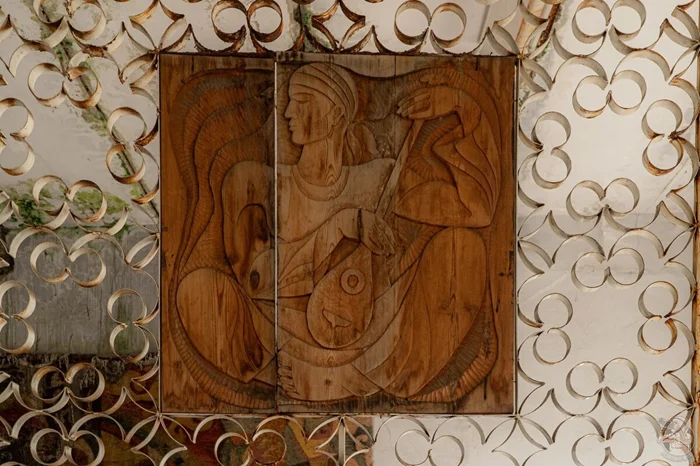 Огромную, светлую, но пахнущую плесенью и мокрой штукатуркой комнату украшают резные деревянные панно и ковёр! Вот уж действительно завод с региональной спецификой... Ещё ни разу, на заброшенных производствах я не видел, чтобы ковром украшали стену. Да ещё таким огромным...