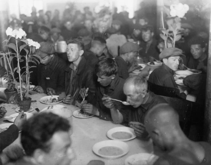 12. «Н. Ф. Филиппов и сын Костя за обедом в столовой завода "Красный пролетарий"».