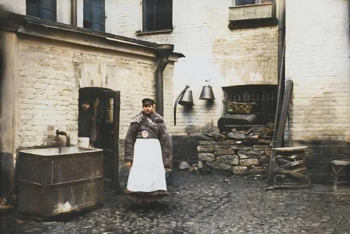 Дворники у бака с водой во дворе городского дома, 1900-1910 год.