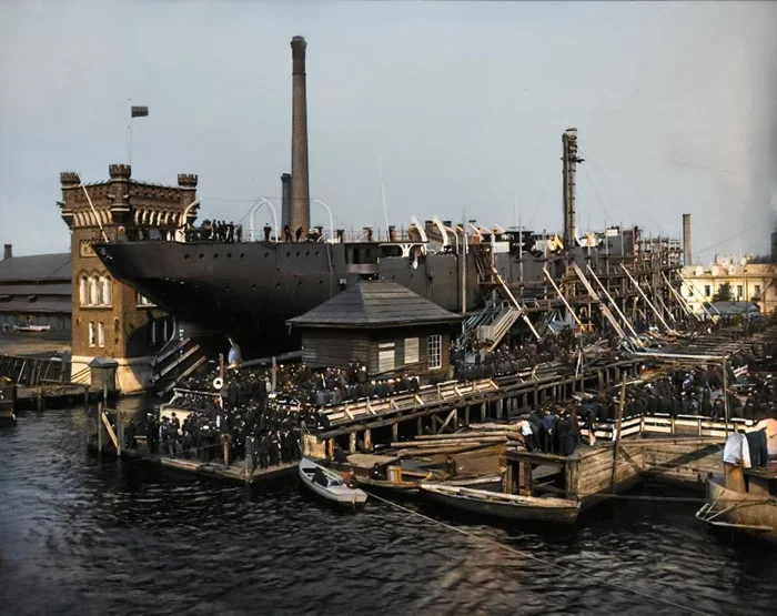 Минный заградитель "Амур" в момент спуска, 1907 год.