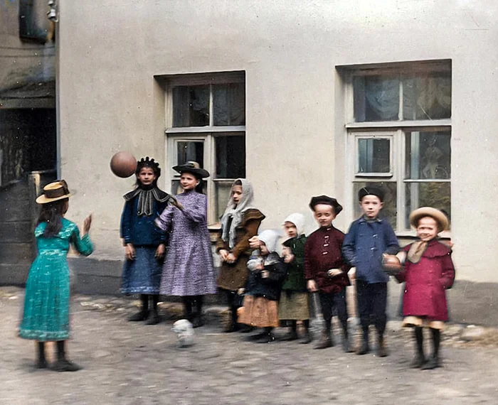 Дети играют в мяч во внутреннем дворе доходного дома, 1903 год.