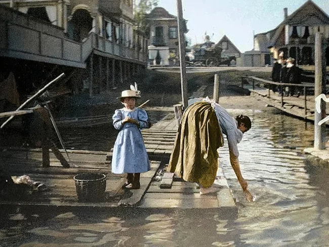 Прачка стирает белье у пристани ресторана "Славянка", парк "Ливадия" на Новодеревенской набережной.