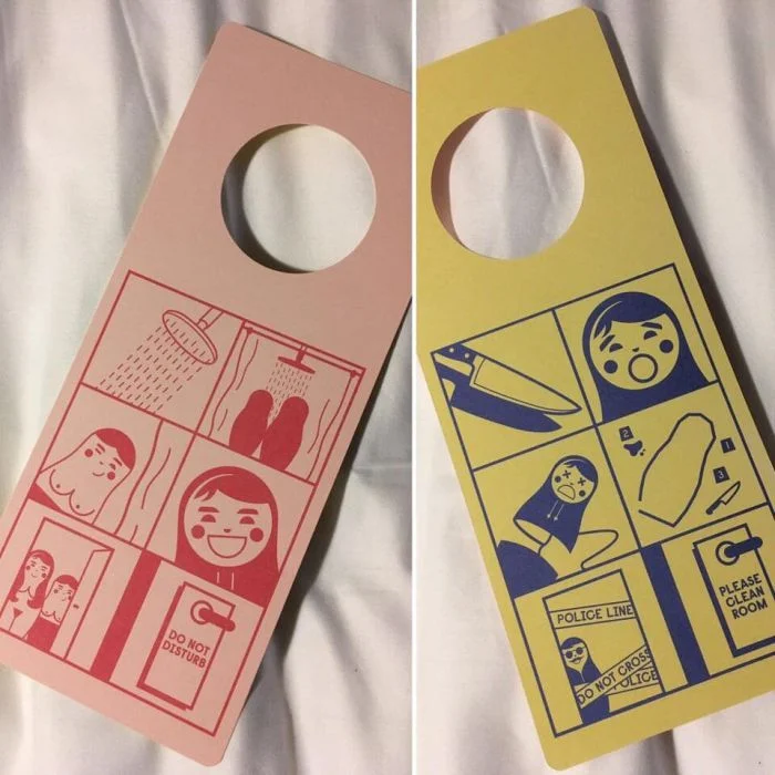 Знаки, которые можно повесить на ручку в номере отеля: «не беспокоить» и «пожалуйста, уберите номер»