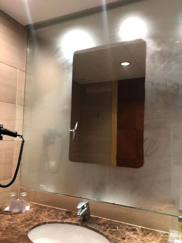 Часть зеркала в душевой гостиничного номера не запотевает