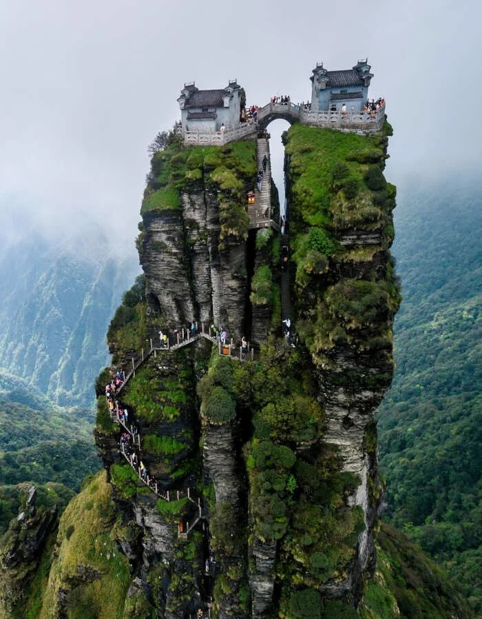Эти древние буддийские храмы находятся на скалистом отроге в горах Улинг, и выглядят нереальными. Чтобы добраться до них, нужно пройти более 8000 шагов, примерно, за четыре часа. Верхняя часть горы называется «Золотая вершина». Храмы стоят на отдельных скалах, разделённых узким ущельем, пересечь которое можно по арочному каменному мостику в виде дракона.