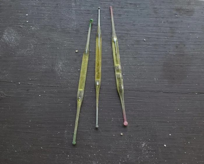 5. Нашёл под ванной во время ремонта. Маленькие стеклянные трубочки, наполненные жидкостью
