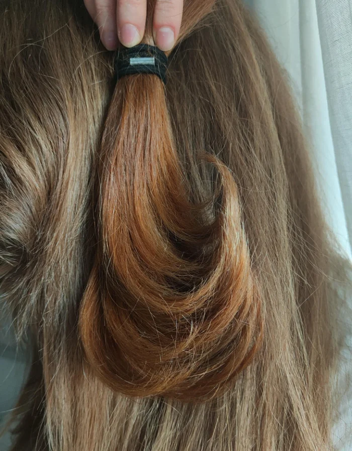 «Часть моих рыжих волос, которые состригли в 16 лет, по сравнению с моими выцветшими волосами сейчас в 27»