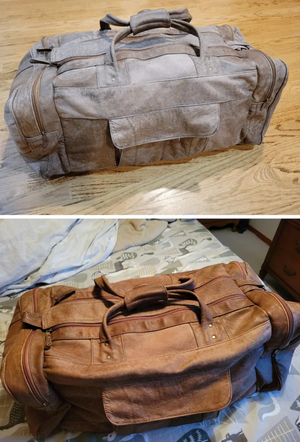 «Старая кожаная сумка моего дедушки. Я потратил на неё полбутылки средства для чистки кожи и ещё полбутылки кондиционера. Теперь она выглядит почти как новая. Надеюсь, она прослужит моей семье ещё 30 лет»