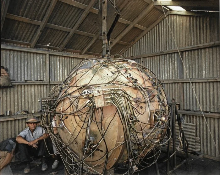 Физик Норрис Брэдбери сидит рядом с «Гаджетом» — ядерным устройством, разработанным учеными для испытания первой в мире атомной бомбы, на полигоне Аламогордо в Нью-Мексико, 1945 год.