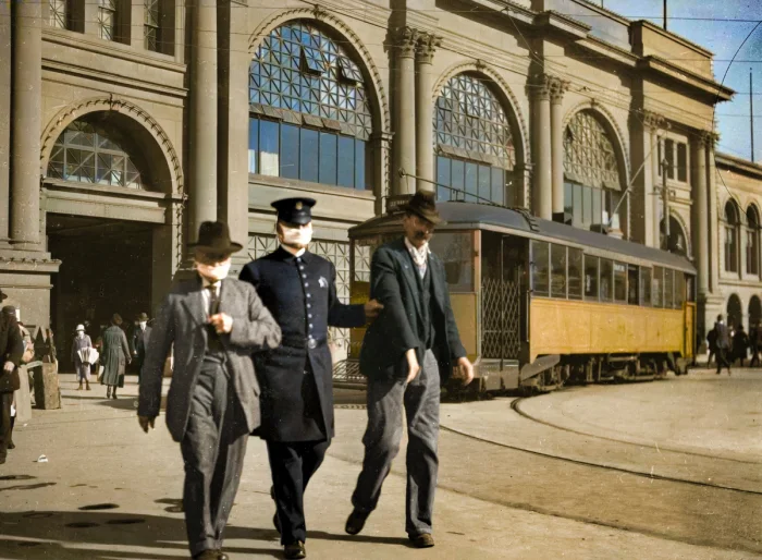 Пандемия "испанки". Офицер задержал человека без маски. Сан-Франциско, 1918 год.