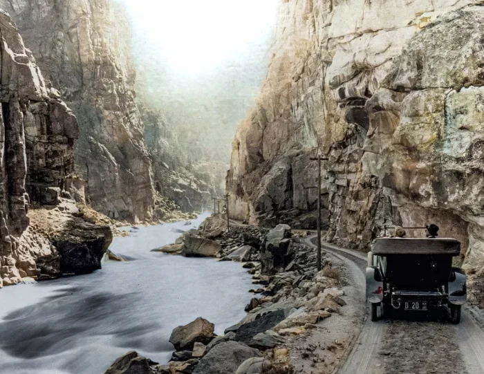 Туристы путешествуют по грунтовой дороге вдоль реки Йеллоустоун, США, 1920-е годы.