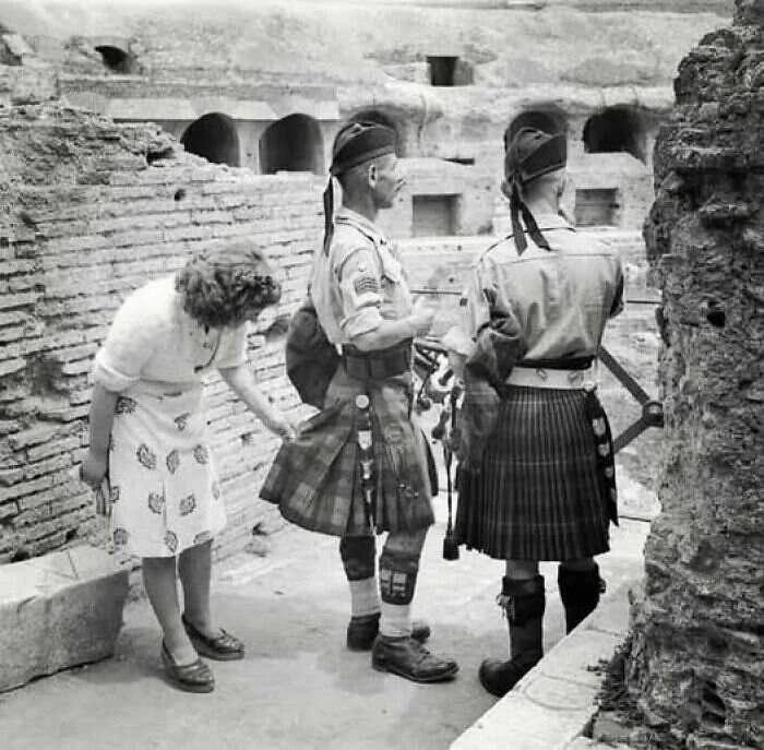 Итальянка рассматривает килт шотландского солдата. Колизей, Рим, 1944 год