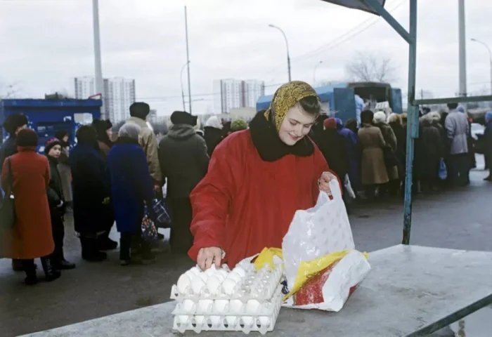 13. Очередь за куриными яйцами в Москве, 1992 год. В январе 1992 года яйца стоили 8-10 руб. за десяток, а в декабре уже 80-100 руб.