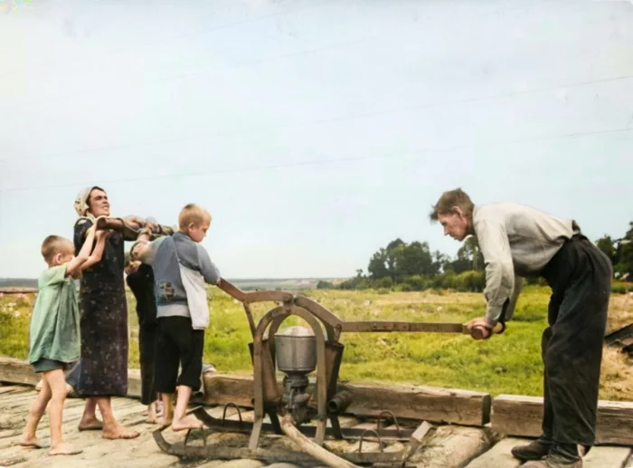 Семья, занимающаяся водоснабжением. СССР, 1947 год.