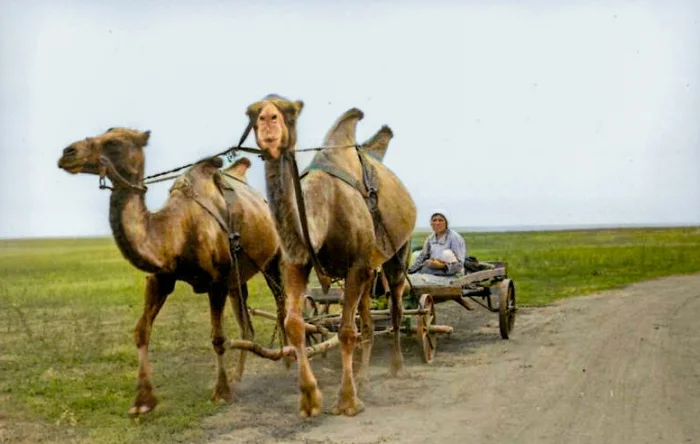 Телега, запряжённая двугорбыми верблюдами. СССР, 1942 год.