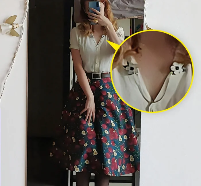 "Я в восторге, как удачно принт юбки совпал с брошками на моей блузке"
