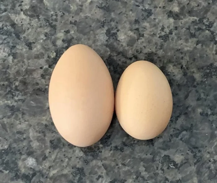 «Обычное яйцо и длинное, которое наша курица снесла сегодня. В нем оказалось два желтка»