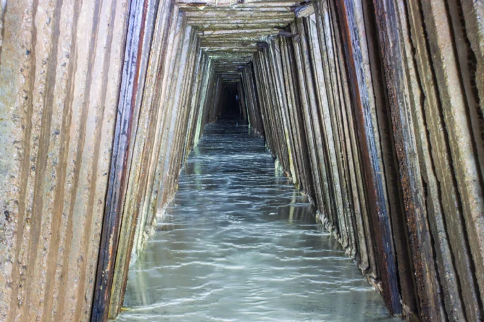 После нескольких сотен метров «заплыва» уровень воды наконец-то снизился, но тоннель начал вызывать серьёзные сомнения в своей прочности.