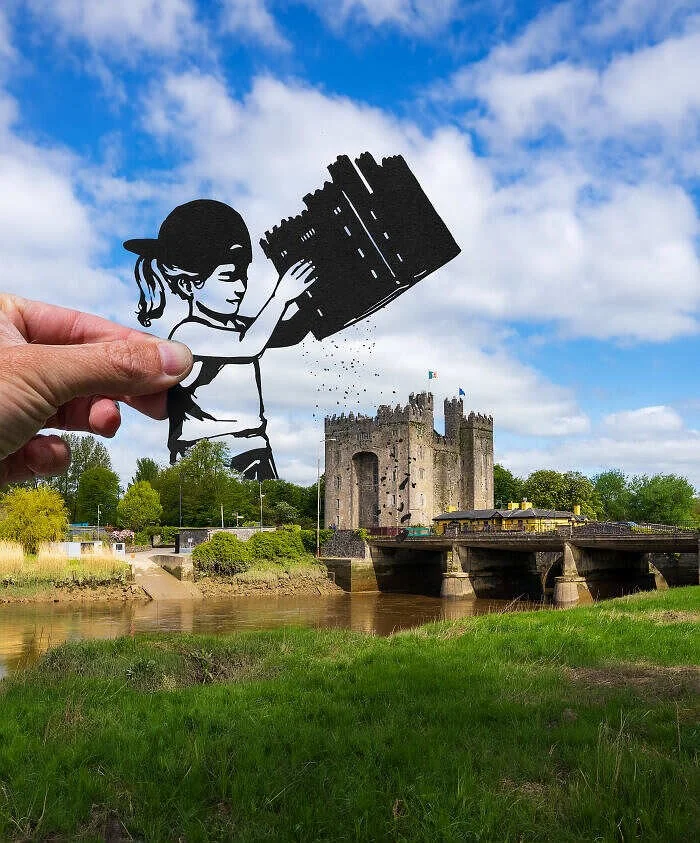Художник предлагает зрителям взглянуть на мир с новой перспективы, создавая бумажные фигуры, которые гармонично вписываются в окружающие ландшафты. Иными словами, он преобразует привычное в нечто необычное.