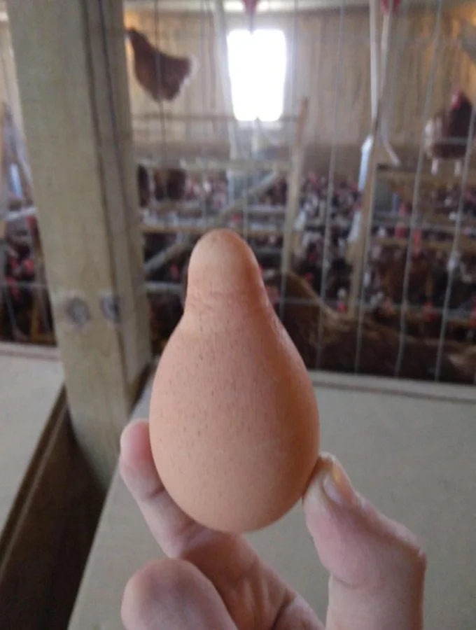 Кажется, курочка решила удивить своего хозяина, снесши необычное яичко
