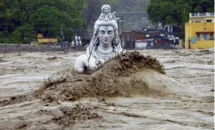 Затопленная статуя Шивы-Разрушителя во время наводнения в штате Уттаракханд, Индия
