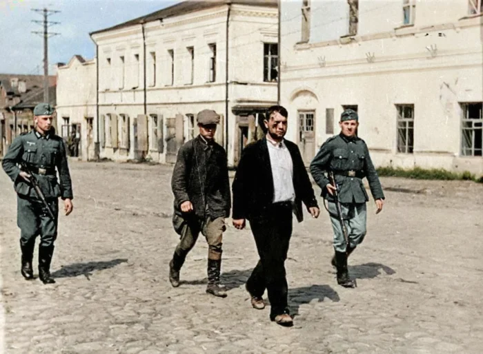 Немецкий патруль ведет пойманных советских солдат, переодетых в гражданскую одежду, по улице города Велиж, 1941 год.