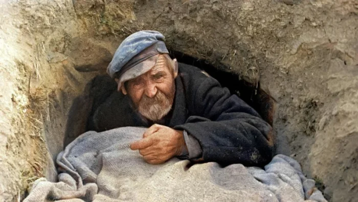 Колхозник С.Т. Степанченко в своем укрытии в деревне под Дорогобужем. Смоленская область, август 1941 года.