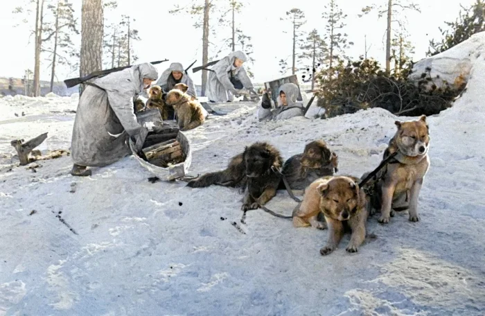 Красноармейцы доставляют боеприпасы на передовую с помощью собачьих упряжек и лодок-волокуш. Карельский фронт, Мурманская область, 1943 год.