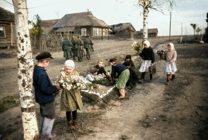 Дети возлагают цветы на могилы советских солдат. Ржев, 1943 год.