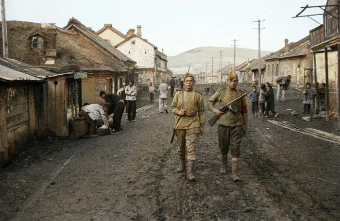 Советские солдаты патрулируют поселок в Маньчжурии, 1945 год.