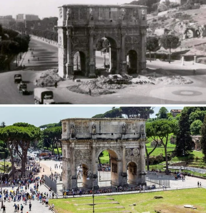 Триумфальная Арка Константина в Риме — это исторический памятник, запечатлённый на фотографии 1943 года. На нижнем снимке — та же арка в наши дни.