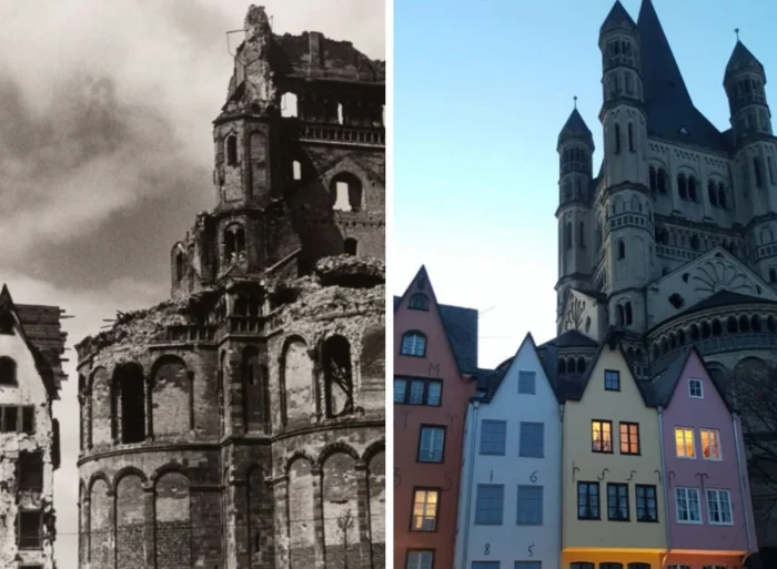 Посмотрите на церковь святого Мартина в Кёльне: в 1946 году её состояние вызывало сомнения в том, что она доживёт до наших дней. Но справа — её современное состояние!