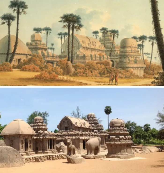 Это памятники в Индии, известные как Панча Ратхас. На снимке 1825 года и в современности.