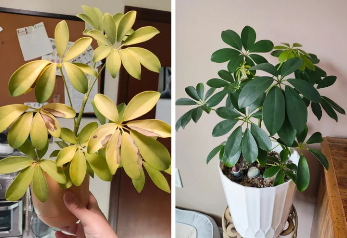 «Этот цветок мне отдали с сильным заражением щитовками. Мы не могли понять, откуда они взялись, так как ни на одном другом растении в доме их не было. Я забрала его домой и попыталась привести в порядок. На это ушло около двух месяцев. Сейчас с ним все хорошо: он находится в хорошо освещенном месте, пересажен около месяца назад и выпускает новые листья!»
