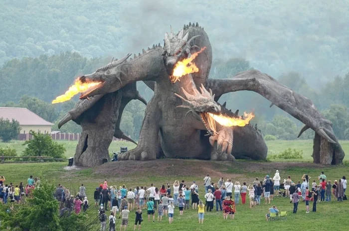 Высота этого сказочного дракона составляет 15 метров. Трёхголовый Горыныч, созданный скульптором Владимиром Колесниковым в 2017 году, умеет рычать и выплевывать настоящее пламя.