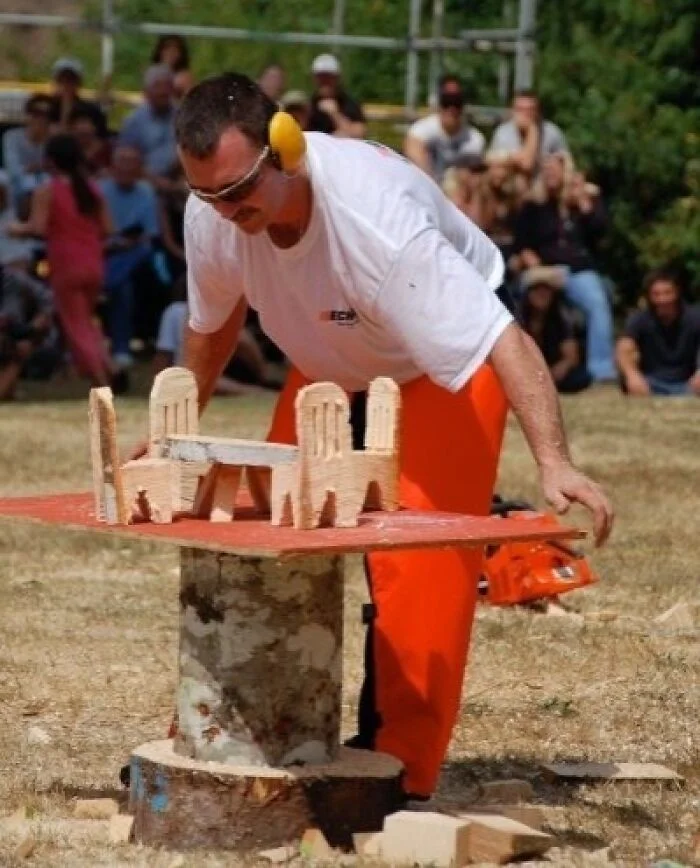 У участников было всего пять минут, чтобы создать стул из пня. Каждый вырезал свой стул, но один человек снова и снова резал пень бензопилой, используя странные техники. Когда он сделал последний надрез, из остатков пня словно сами собой возникли четыре крошечных стула и стол. Это было невероятно!