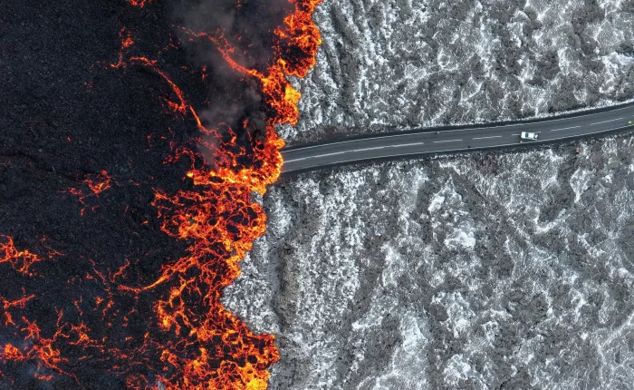Лава течёт по дороге недалеко от Гриндавика на полуострове Рейкьянес, 21 ноября 2024 года.