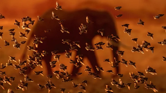 В золотых лучах кенийского заката африканский кустарниковый слон шагает по равнине, а в небо поднимается стая красноклювых ткачей, символизируя гармонию жизни в саванне. Фотография сделана 15 сентября 2024 года.