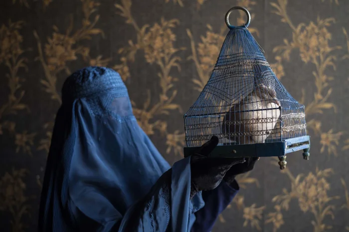 Афганская женщина в голубой парандже держит в клетке голубя. Этот образ олицетворяет актуальные темы: клетка символизирует ограничения и преграды, а голубь — стремление к свободе. Фотография сделана 21 марта 2024 года.