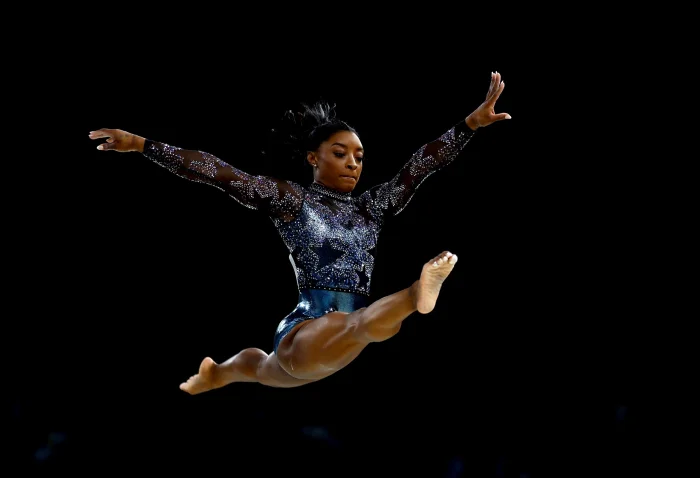 Гимнастка Симона Байлз на Олимпийских играх 2024 года в Париже. Лидер сборной США привела команду к золоту в командном многоборье. Сама Байлз стала 7-кратной олимпийской чемпионкой и 23-кратной чемпионкой мира, занимая первое место в истории по общему количеству наград.