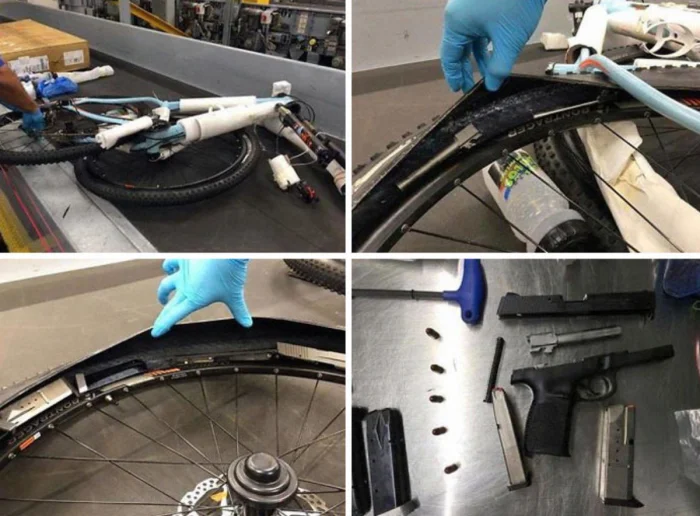 Разобранный пистолет, аккуратно спрятанный внутри велосипедных шин