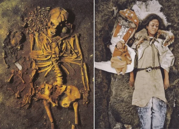 Рядом с её головой были найдены 200 зубов благородного оленя, а младенец лежал на лебедином крыле с ножом у бедра. Считается, что женщина скончалась во время родов.