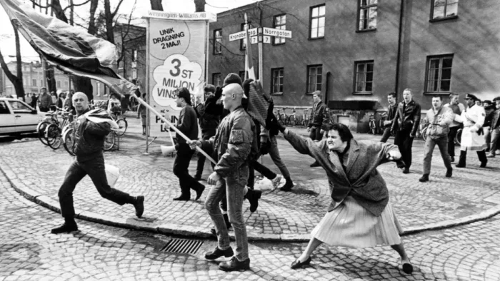 2. 38-летняя Данута Даниэльссон бьёт неонациста сумочкой, Векшё, Швеция, 13 апреля 1985 года