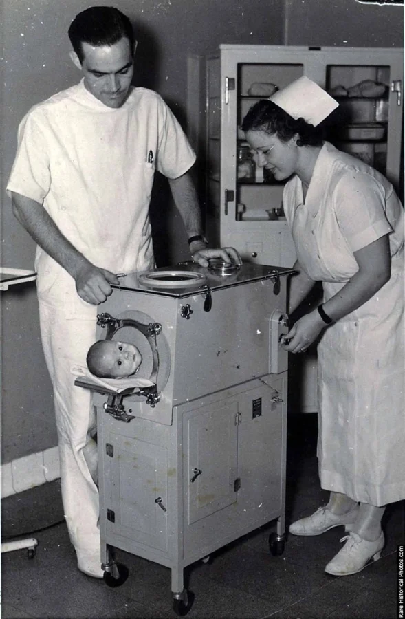 15. Младенец, больной полиомиелитом, в аппарате "Железные лёгкие", 1940-е
