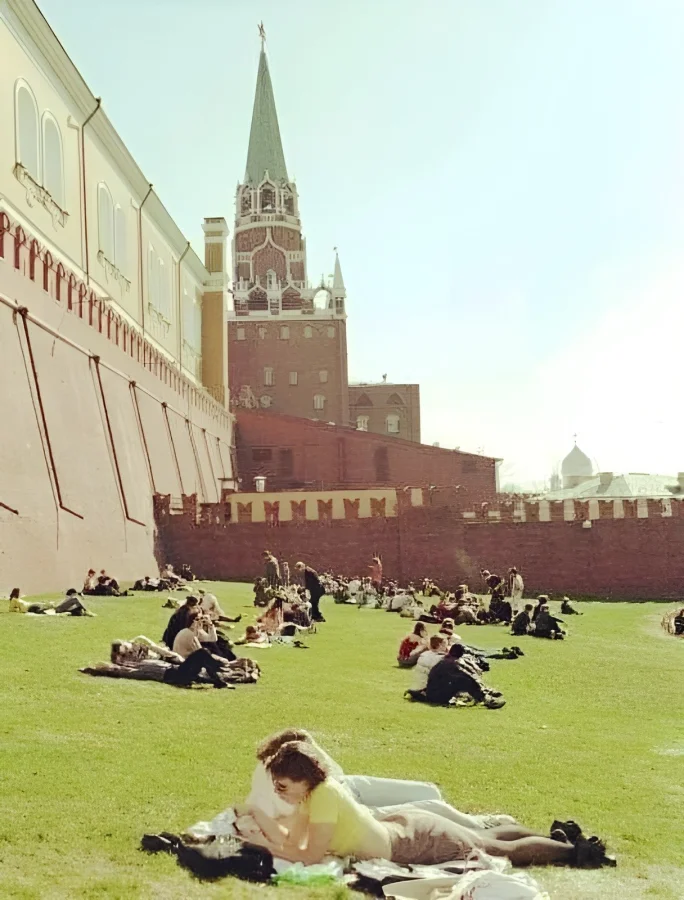 19. Жители Москвы отдыхают на газоне у Кремлёвской стены, 1999 год
