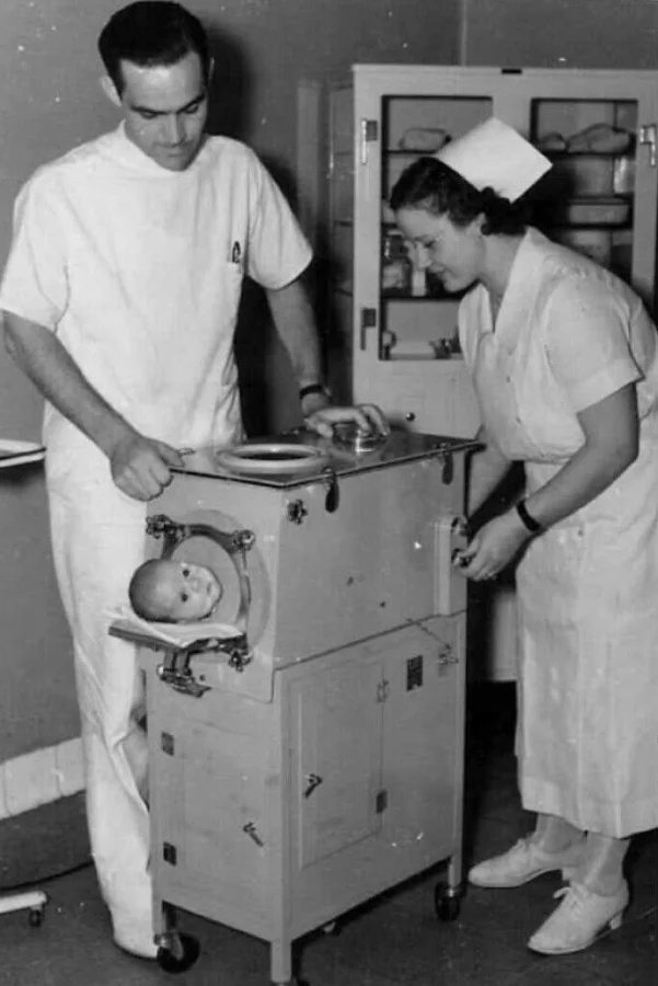 6. Новорожденный, страдающий полиомиелитом, в крошечном аппарате для искусственной вентиляции лёгких, 1940 год