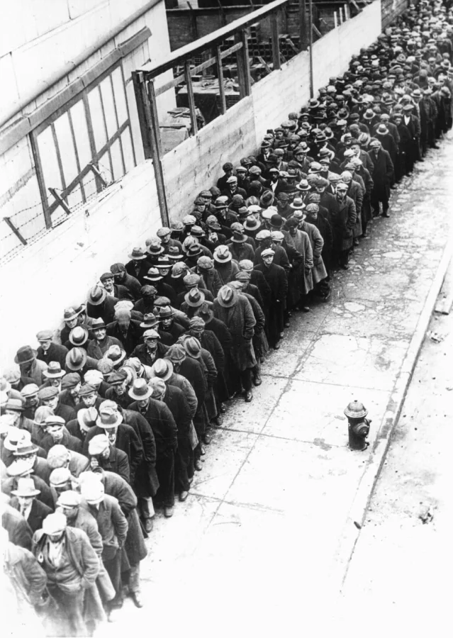 8. Мужчины, ожидающие в очереди на получение работы во время Великой депрессии, Америка, тридцатые годы