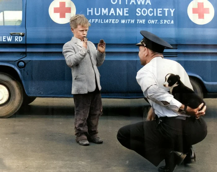 Альберт Клармо из Оттавского общества защиты животных готовится вернуть потерявшегося щенка маленькому мальчику.
