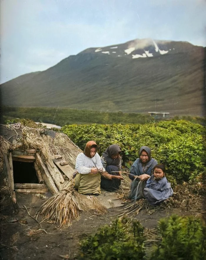 Алеутки собирают траву для плетения. Остров Атту, 1909 год.